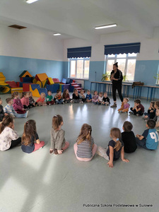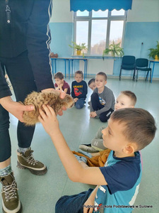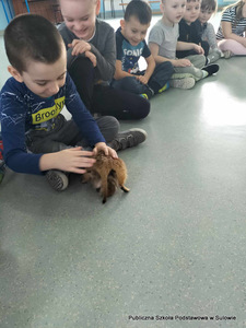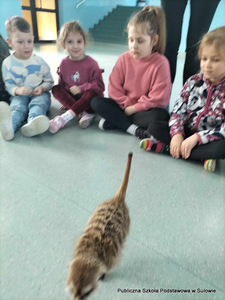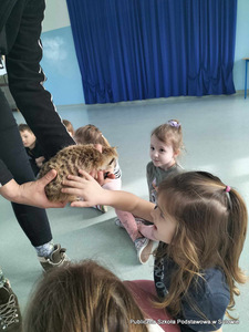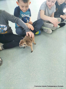 Nasze przedszkole odwiedził niezwykły gość - surykatka o imieniu Timon wraz ze swoją opiekunką. Dzieci poznały zwyczaje tego zwierzaka, sposób odżywiania, a także jak prawidłowo się nim opiekować.Timon bardzo chętnie bawił się z dziećmi. Przychodził, kładł się na kolanach, a dzieci głaskały go i przytulały. Na koniec przedszkolaki zrobiły sobie z surykatką pamiątkowe zdjęcie.