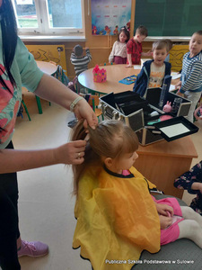 8 marca dzieci poznały zawód fryzjera. Pani fryzjerka zrobiła dziewczynkom bardzo ciekawe fryzury. Natomiast chłopcy zrobili laurki dla swoich koleżanek.