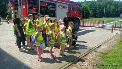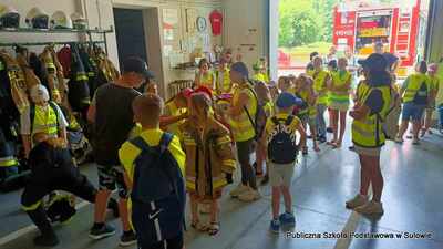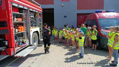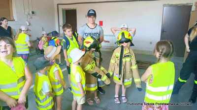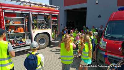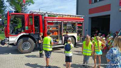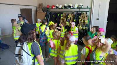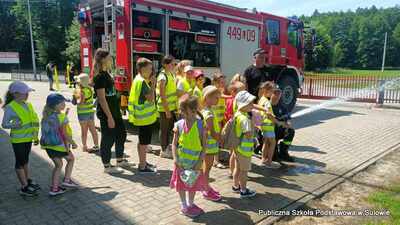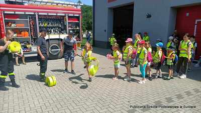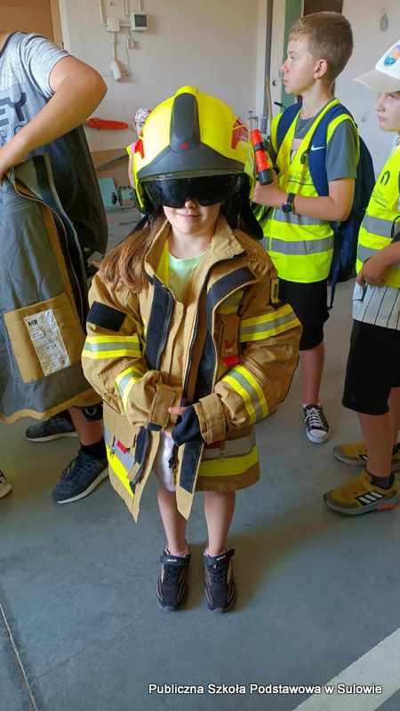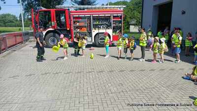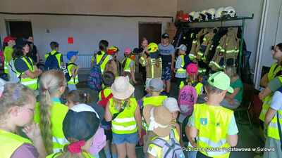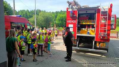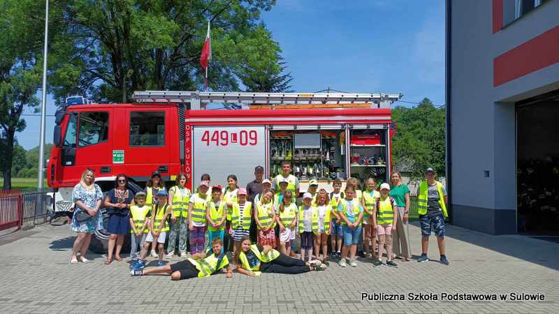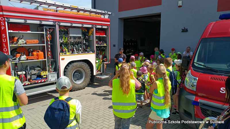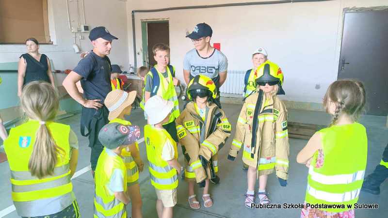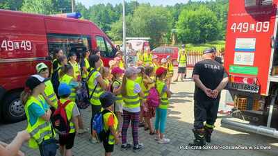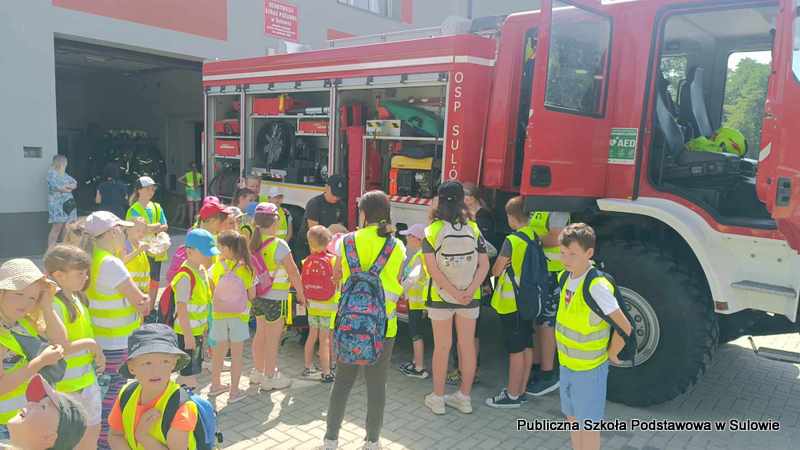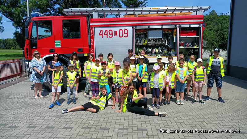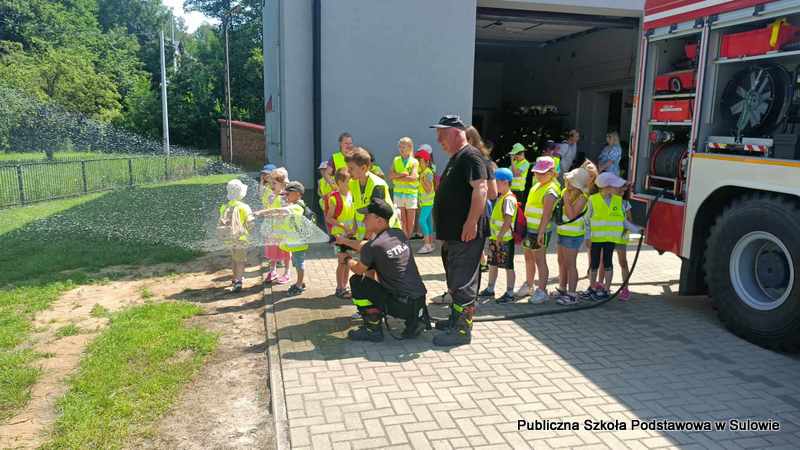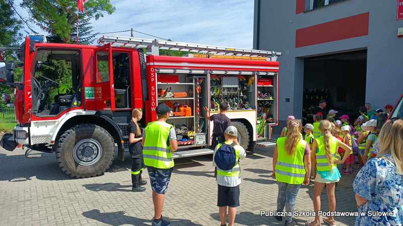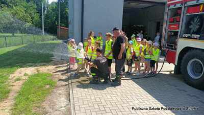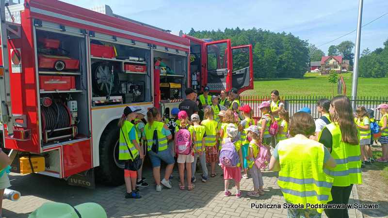 W dniu 19.06.2024 r. uczniowie naszej szkoły wraz z opiekunami wybrali się na pieszą wycieczkę do strażnicy OSP KSRG Sulów. Druhowie strażacy, dh Marcin Szpyra, dh Stanisław Szpyra, dh Daria Dudziak, przedstawili dzieciom na czym polega działalność ochotniczej straży pożarnej, do jakich zdarzeń są wzywani i jaka niosą pomoc. Następnie uczniowie zapoznani zostali ze sprzętem znajdującym się na wyposażeniu wozu bojowego oraz mieli możliwość ubrać się w  ubranie bojowe typu nomex. Na koniec spotkania każdy mógł spróbować sił w rozwijaniu i zwijaniu węzy oraz polewaniu wodą szybkim natarciem.