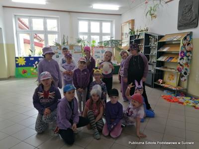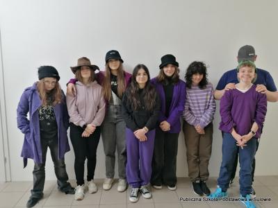 Ponieważ uczniowie kilku klas byli przez cały tydzień w 100% ubrani w dany kolor i dodatki należało zrobić dogrywkę. Bawiliśmy się jeszcze w poniedziałek. Wtedy obowiązywał kolor filetowy i nakrycie głowy.