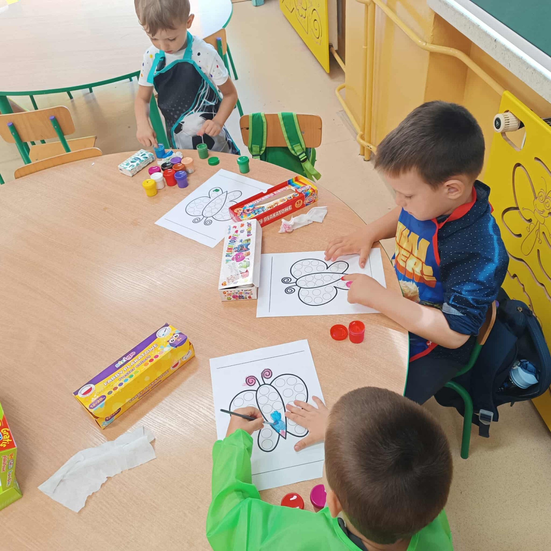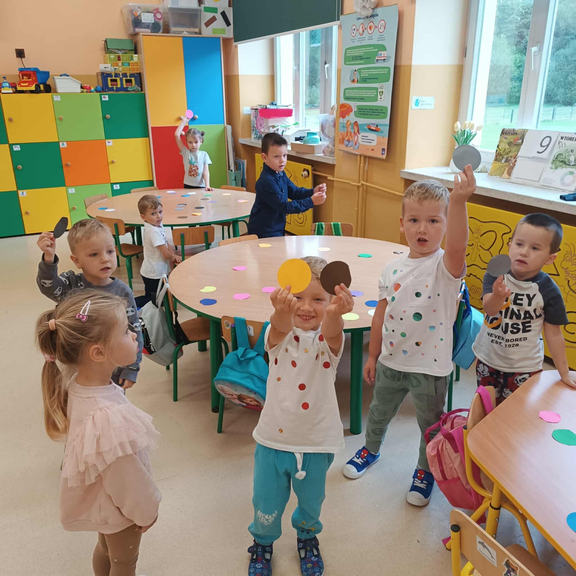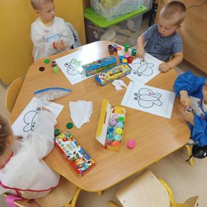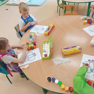 Dzieci tego dnia przystroiły się w kolorowe kropki oraz chętnie uczestniczyły w zabawach i zadaniach, oczywiście z kropką w roli głównej. Wspólnie odkryliśmy, że kropki towarzyszą nam dookoła w naszym codziennym życiu, nawet na naszym ciele i u zwierząt. Dzieci wymyślały co może powstać z kropki, tworzyły ciekawe prace plastyczne. Wspólnie liczyliśmy, segregowaliśmy kolorowe kropki i bawiliśmy się z kropkami przy muzyce.