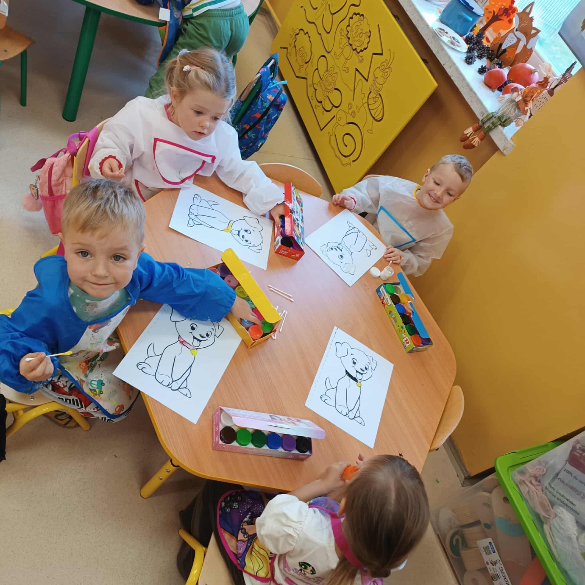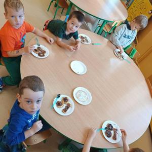 Podczas zajęć dzieci opowiadały o swoich pupilach, oglądały zdjęcia różnych psów i wspólnie zastanawiały się, czego potrzebuje pies, aby był szczęśliwy. Wzięły też udział w wesołych zabawach ruchowych „Na spacer z pieskiem”, naśladując zachowanie i ruchy swoich ulubionych zwierzaków. Nie zabrakło części plastycznej – dzieci malowały farbami wesołe kundelki oraz ozdabiały ciasteczka w kształcie łapek i kostek, które później wszyscy zjedli ze smakiem. W czasie zabawy przedszkolaki przypomniały sobie również, jak należy zachowywać się wobec zwierząt i dlaczego warto pomagać tym, które nie mają domu.