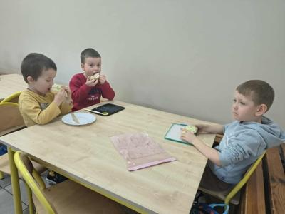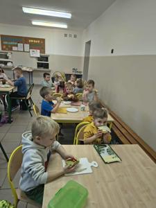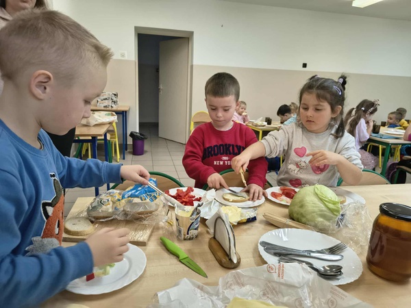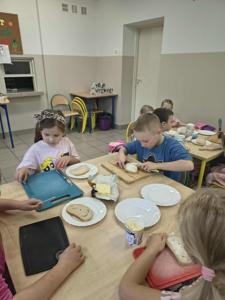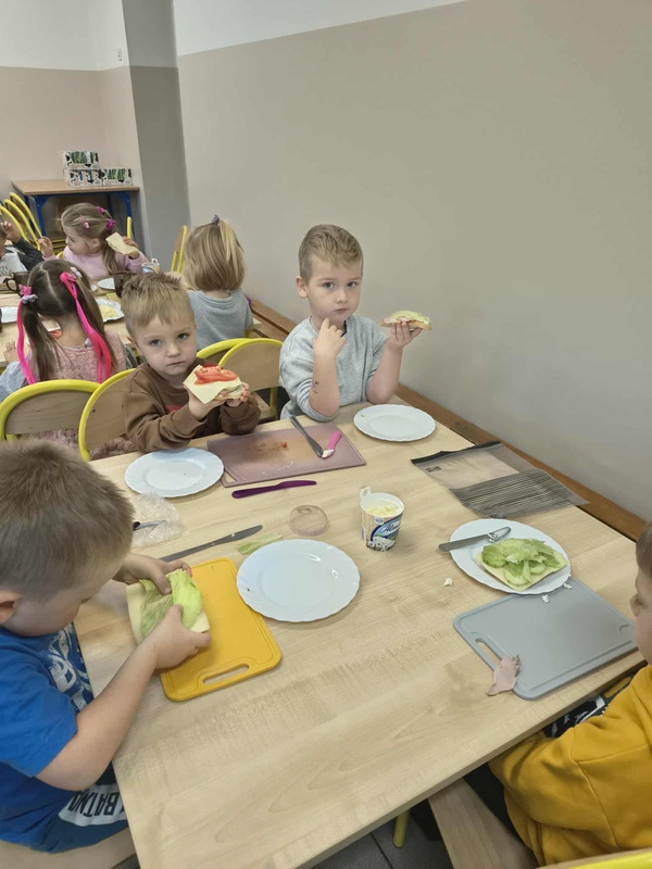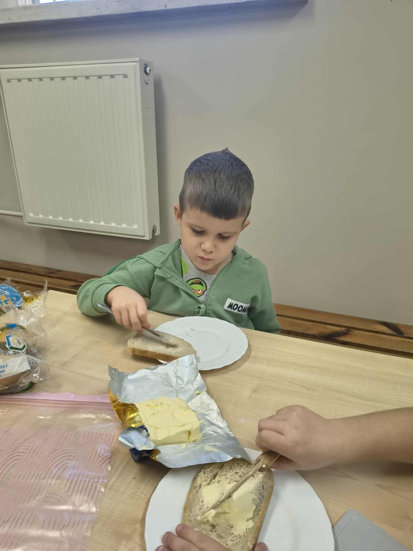 Po porannych zajęciach, każde dziecko otrzymało świeże pieczywo, warzywa, sery, wędliny i inne pyszne dodatki. Wszystkie maluchy z wielkim zaangażowaniem przystąpiły do przygotowywania swoich kanapek – smarowały chleb, układały składniki i tworzyły różne kombinacje smakowe. W trakcie pracy dzieci miały mnóstwo radości, a także chętnie dzieliły się swoimi pomysłami na idealną kanapkę.