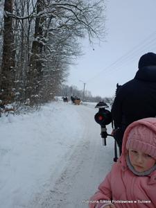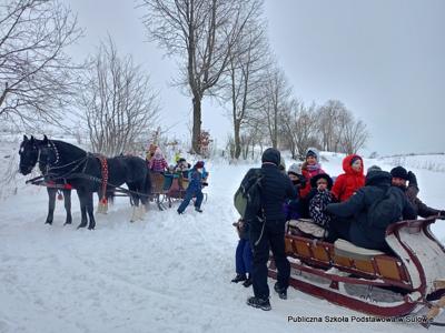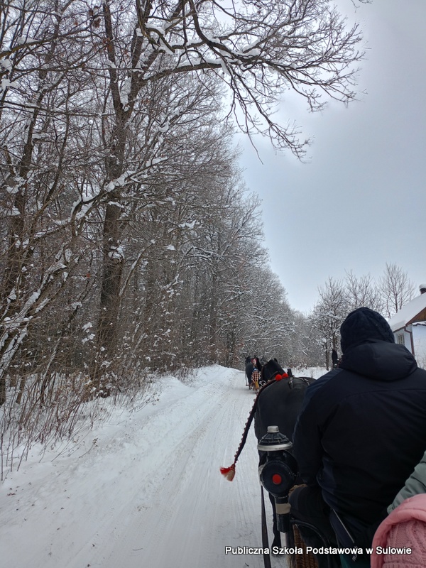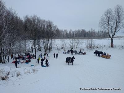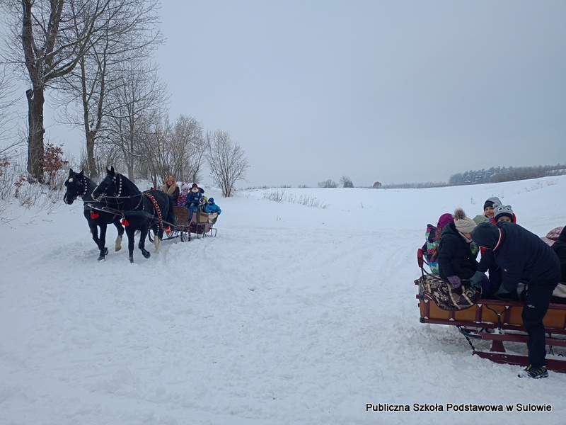 W dniu 14.01.2026r.uczniowie klasy 1-3 wzięli udział wyjątkowym zimowym wyjeździe na kulig. Była to doskonała okazja do wspólnej zabawy integracji oraz aktywnego spędzania czasu na świeżym powietrzu. Dzieci z radością uczestniczyły w przejażdżce saniami, podziwiając zimowe krajobrazy i ciesząc się atmosferą prawdziwej zimowej przygody. Nie zabrakło uśmiechów, śmiechu oraz pozytywnych emocji. Po kuligu uczniowie mieli okazję ogrzać się przy ognisku, gdzie piekli kiełbaski i odpoczywali po wspólnej zabawie. Wyjazd dostarczył dzieciom wielu niezapomnianych wrażeń i był wspaniałą okazją do budowania relacji koleżeńskich. Wszyscy wrócili zmęczeni, ale bardzo zadowoleni to był dzień pełen radości, który na długo pozostanie w pamięci uczestników. Serdecznie dziękujemy Rodzicom za zaangażowanie, pomoc w organizacji wyjazdu oraz wspólnie spędzony czas. Dzięki państwa współpracy możliwe było stworzenie dzieciom bezpiecznych warunków do zabawy i przeżycia tak wspaniałej zimowej przygody.